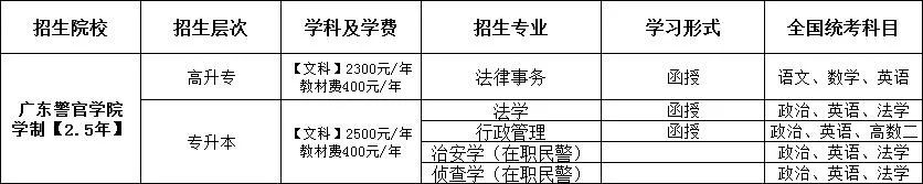 学院前身是广东省公安干部学校,创办于1949年11月。1958年3月,与省政法干校、省民警干训大队、广州市公安学校、广州市行政干部学校合并为广东省政法干部学校。1974年9月,开展普通中专学历教育。1983年3月,建立广东省政法干部学院,开展成人专科学历教育。1988年8月,更名为广东省公安司法管理干部学院。1992年12月,增设广东公安高等专科学校,开展普通专科学历教育。1998年5月,广东省人民警察学校并入广东公安高等专科学校。2004年5月,建立广东警官学院,开展普通本科学历教育。2008年,学院获得学士学位授予权。2012年,通过教育部本科教学工作合格评估。
