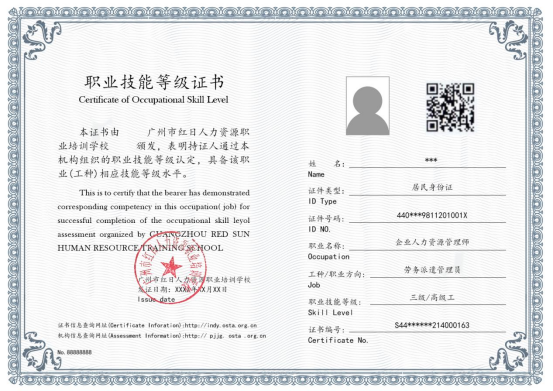 经评价考核合格的考生,由广州市红日人力资源职业培训学校颁发职业技能等级证书,证书信息可在人力资源和社会保障部“技能人才评价证书全国联网查询”系统查询(zscx.osta.org.cn 或 jndj.osta.org.cn)。
