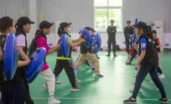 他们身穿战术背心,手持特警装备,警棍盾牌学习体验,攻防一体,英姿飒爽。