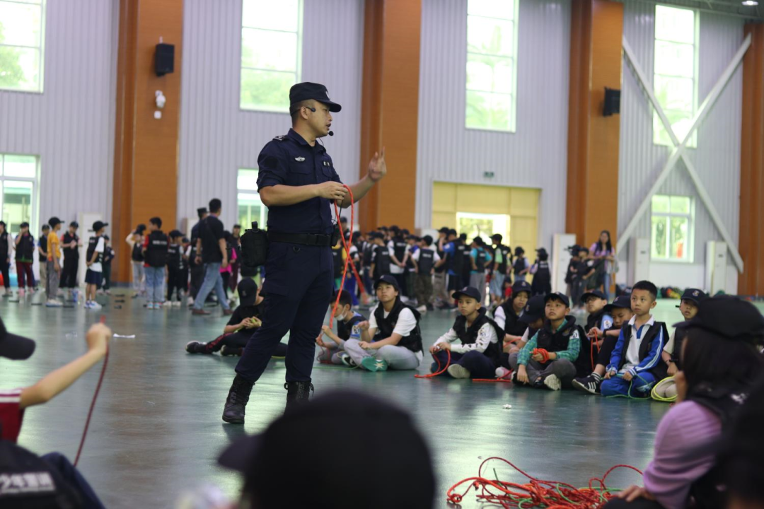 火灾现场,若被困高层,在条件允许的情况下如何逃生呢?教官通过动作分解的方式,向“小警察”们讲授逃生绳结的制作和逃生方法,同时也向他们展示了一些其他常用的绳结的打法。