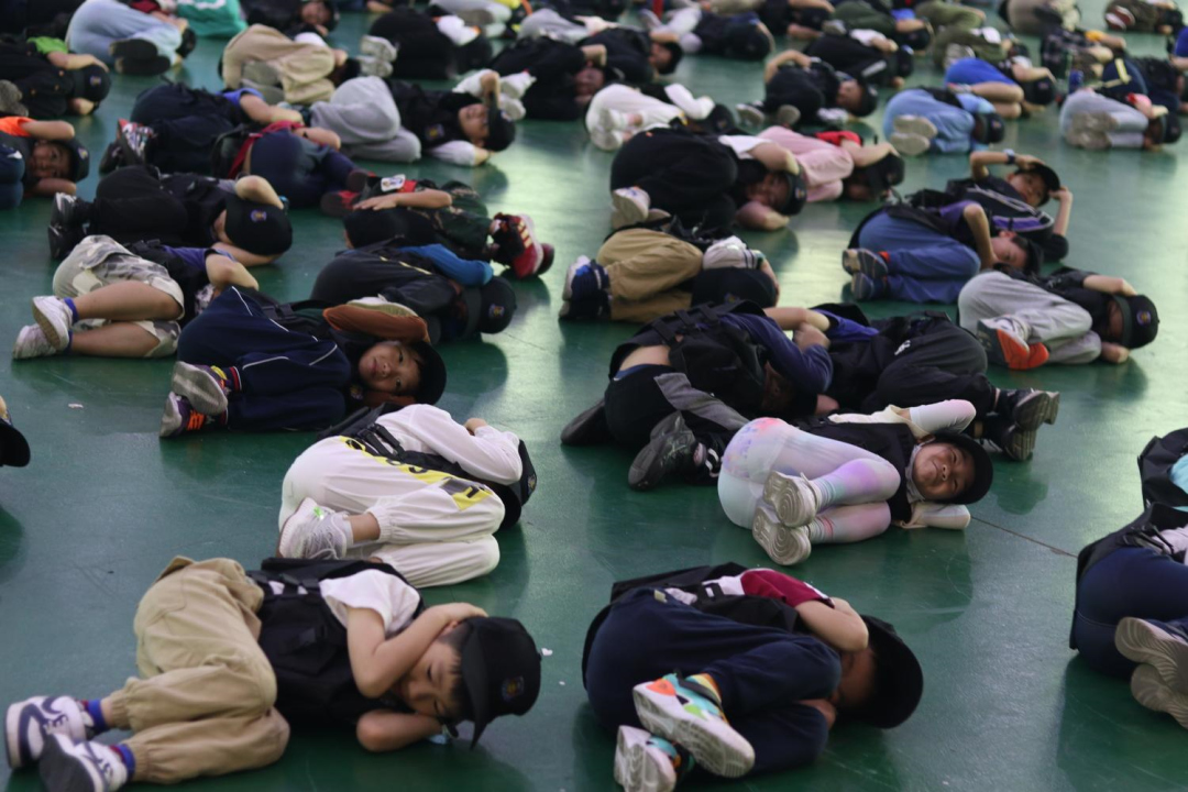 教官一声“遇到踩踏事件,请做好防备!”,“小警察”迅速做好防护姿势,保障自己的安全。