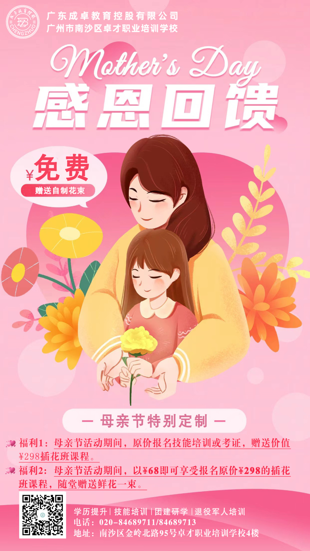 母亲节活动期间,原价报名技能培训或考证,赠送价值298元插花班课程;