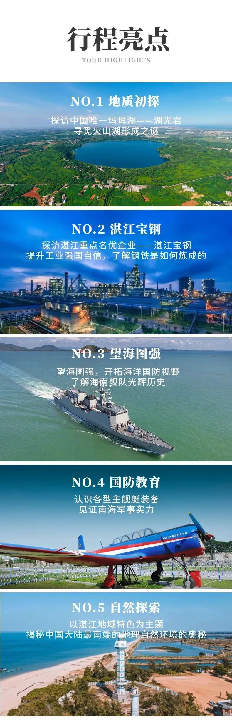 “从一块钢板到一轮钢卷只需要90秒”,在湛江宝钢一起亲眼见证“钢铁是怎样炼成的”;了解中国工业现代化程度,提升工业强国自信心。