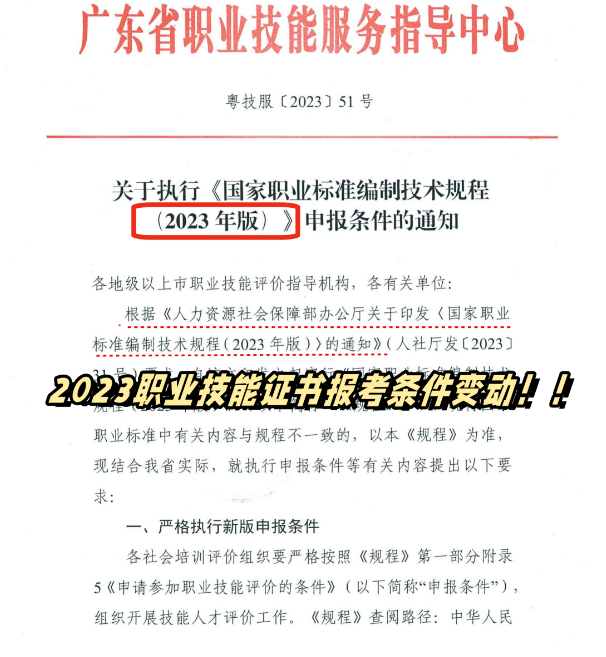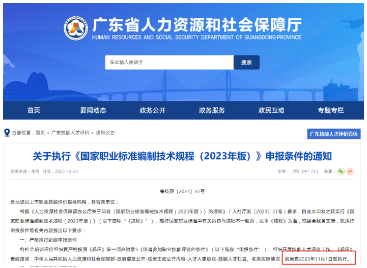 广东省人力资源和社会保障厅官网发布《关于执行<国家职业标准编制技术规程(2023年版)>申报条件的通知》,明确要求“自 2023年11月1日起 按新版申报条件开展技能人才评价工作。”