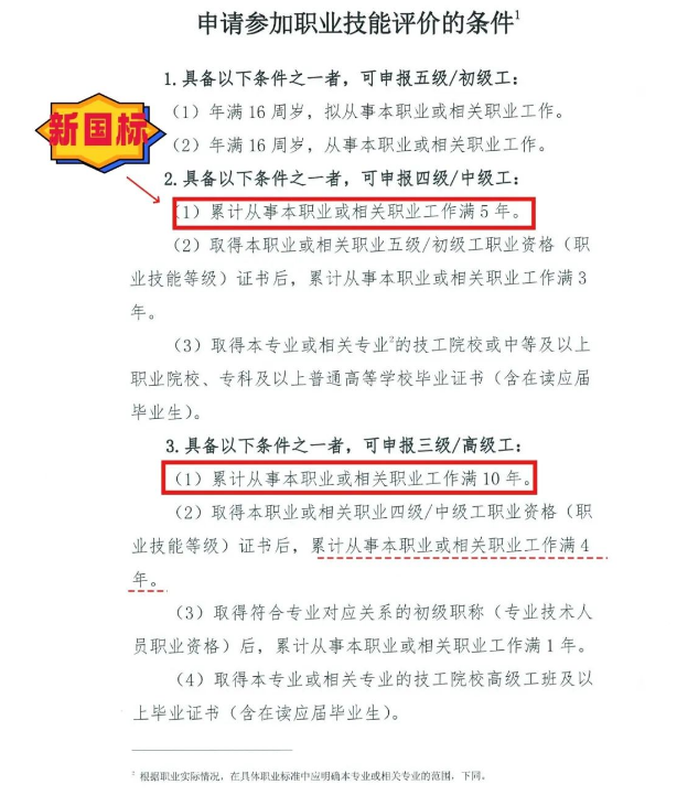 新版《规程》关于申报三级/高级工的条件中明确,具备“累计从事本职业或相关职业工作满 10 年”这一条件,即可申请三级/高级工。这就意味着,新规程打破了初、中、高职业技能等级逐级申报制度,从业 10 年以上,未取得初、中级工等级的“老师傅”可以直接申报“高级工”了。
